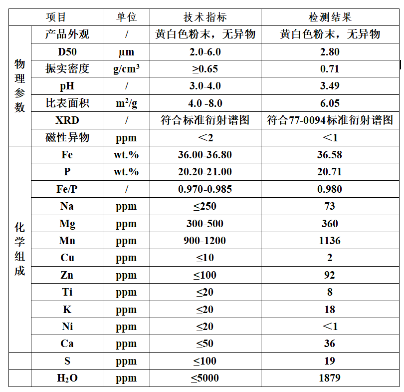 生產(chǎn)的電池級磷酸鐵結(jié)晶度好 ,晶體結(jié)構(gòu)完整;理化指標(biāo)穩(wěn)定