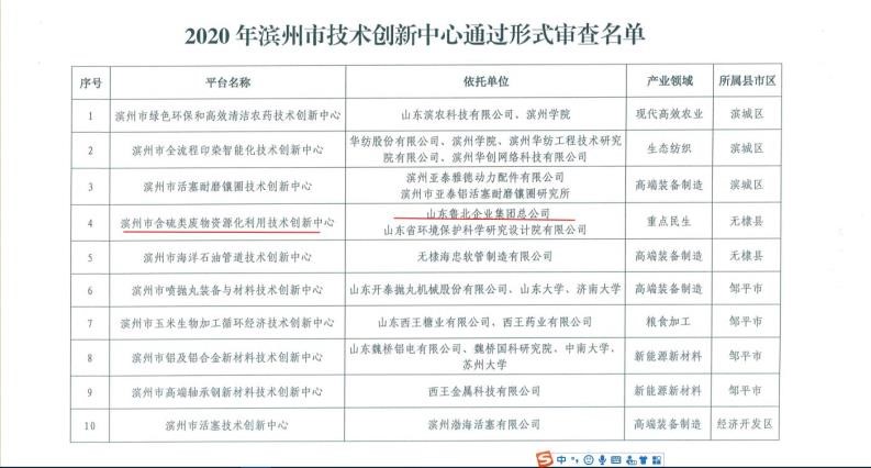 合創(chuàng)建的濱州市含硫類廢物資源化利用技術(shù)創(chuàng)新中心也作為10 個(gè)通過(guò)形式審查的技術(shù)創(chuàng)新中心之一